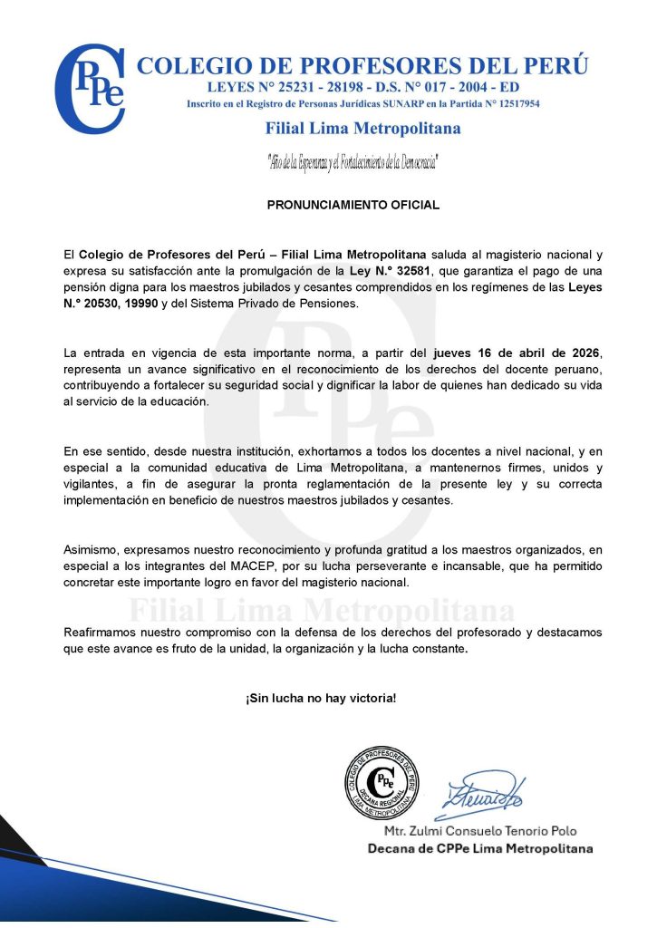 El Colegio de Profesores De Lima Metropolitana, institución profesional, ética y deontológica que promueve la dignificación del magisterio.